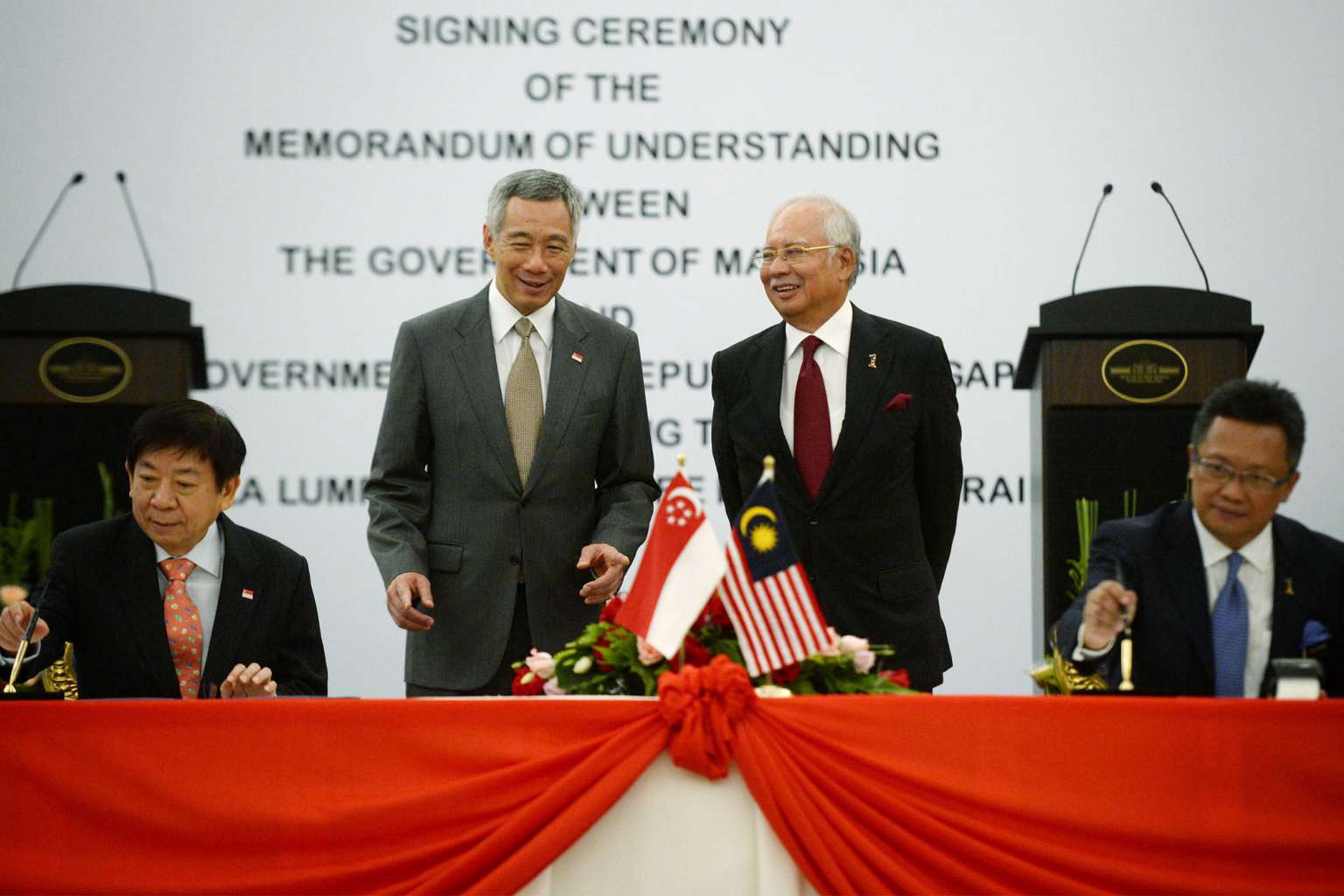 Prime Minister Lee Hsien Loong and his Malaysian counterpart Najib Razak observe the signing of the High Speed Rail memorandum of understanding on July 19, 2016.