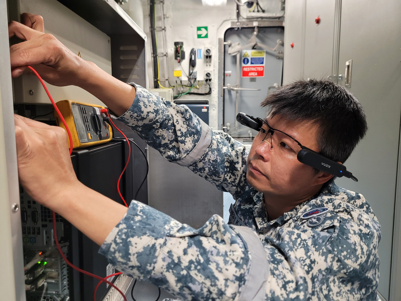 minavy05 - A subject matter expert from the Republic of Singapore Navy on shore looking through what a sailor on board sees when he wears a special pair of glasses with video-chat function. This helps the expert on shore to better provide advice to resolve any faults on board. Credit: MINDEF