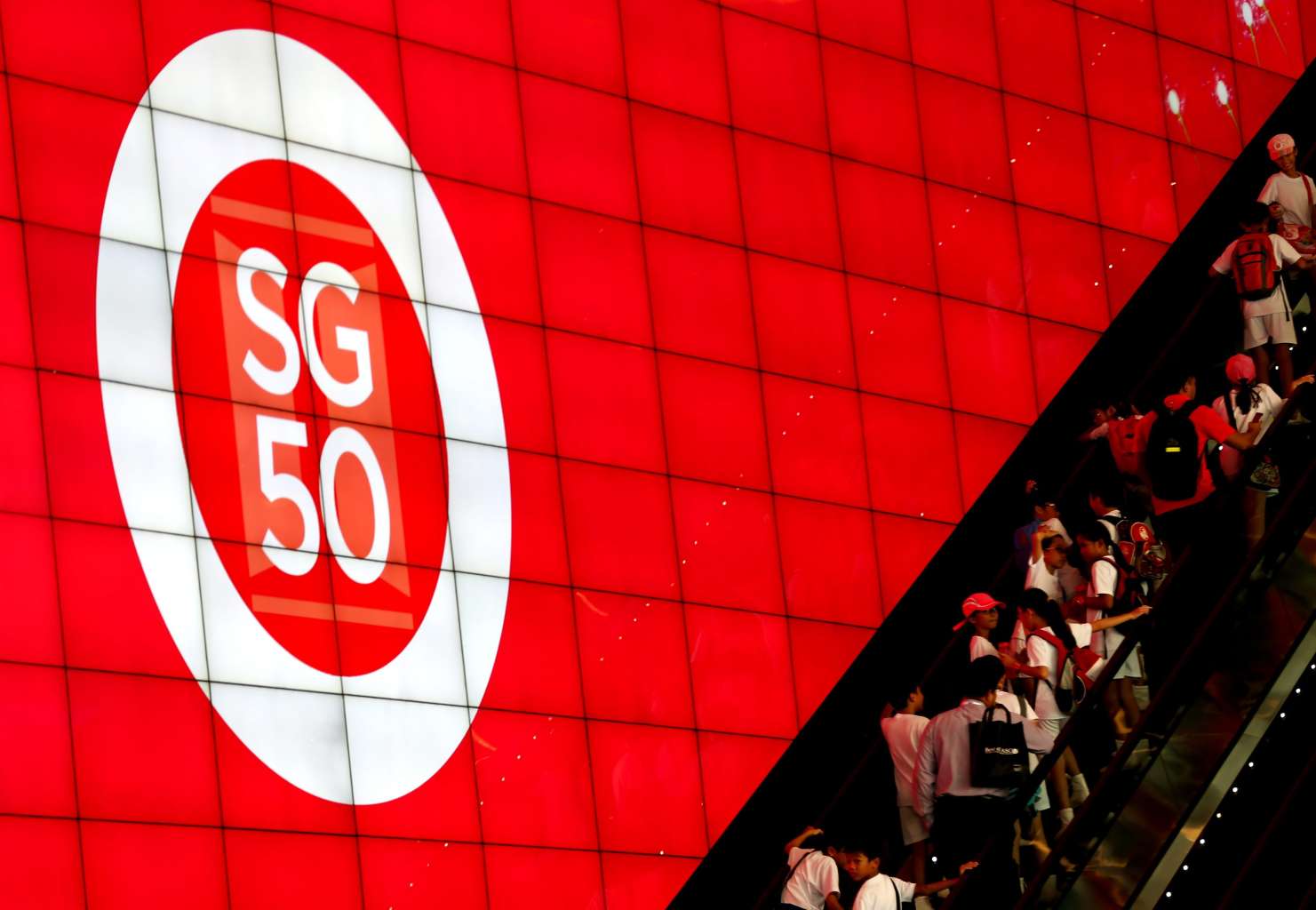 Students ride on an escalator next to the SG50 logo during the National Day Parade preview.
