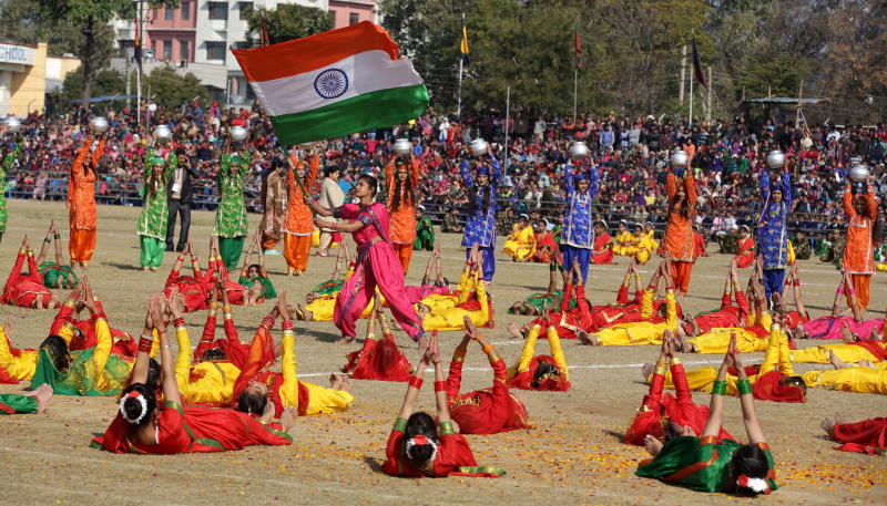 Children waving an Indian flag as they perform a cultural dance during the country's 70th Republic Day celebrations in Jammu, Kashmir, on Jan 26, 2019.