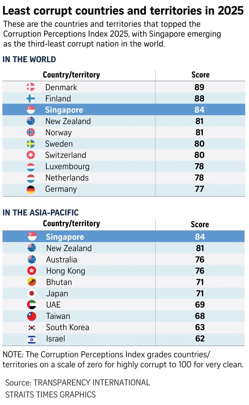 On Feb 10, the Corrupt Practices Investigation Bureau said Singapore’s strong performance in 2025’s rankings is due to robust legislation, effective enforcement and a vigilant society.
