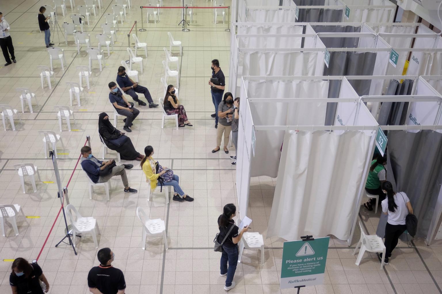 Volunteers waiting to receive the Covid-19 vaccine during a trial run at the vaccination centre at Tanjong Pagar Community Club on Jan 26, 2021.