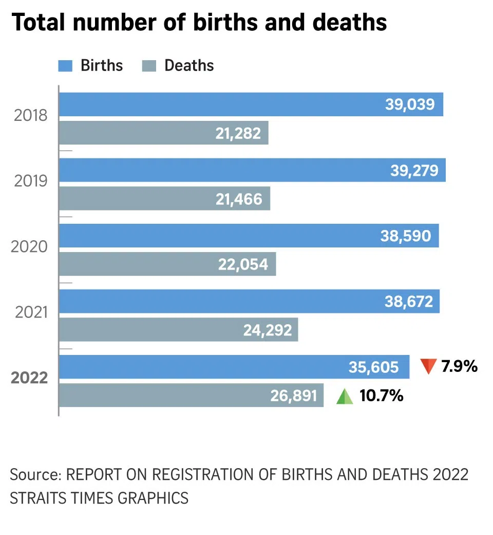 Official figures released by the Immigration and Checkpoints Authority (ICA) showed a 7.9 per cent drop in the number of live births, from 38,672 in 2021
