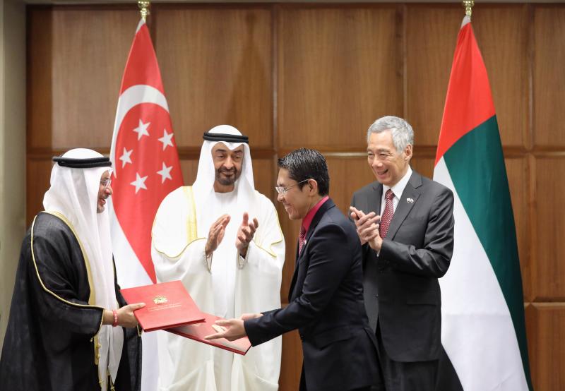 Witnessing the signing at Parliament House were Prime Minister Lee Hsien Loong and the Crown Prince of Abu Dhabi, Sheikh Mohamed bin Zayed Al Nahyan.