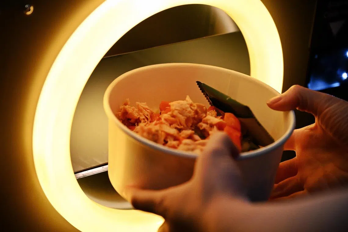 When a customer makes an order, the ingredients are assembled in a serving bowl as the pods dispense portions of 60g for each ingredient.