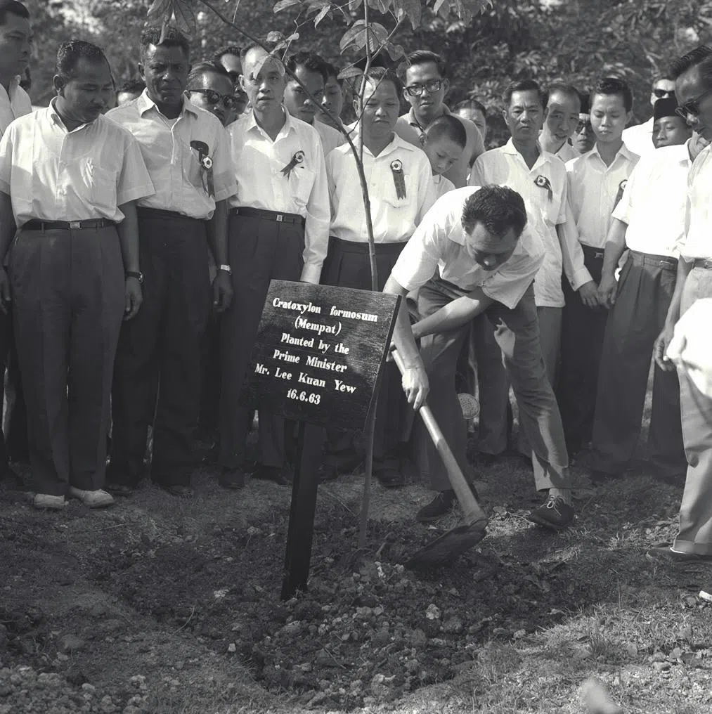 Founding prime minister Lee Kuan Yew planting a Mempat tree at Holland Circus during his tour of Ulu Pandan constituency in June 1963.