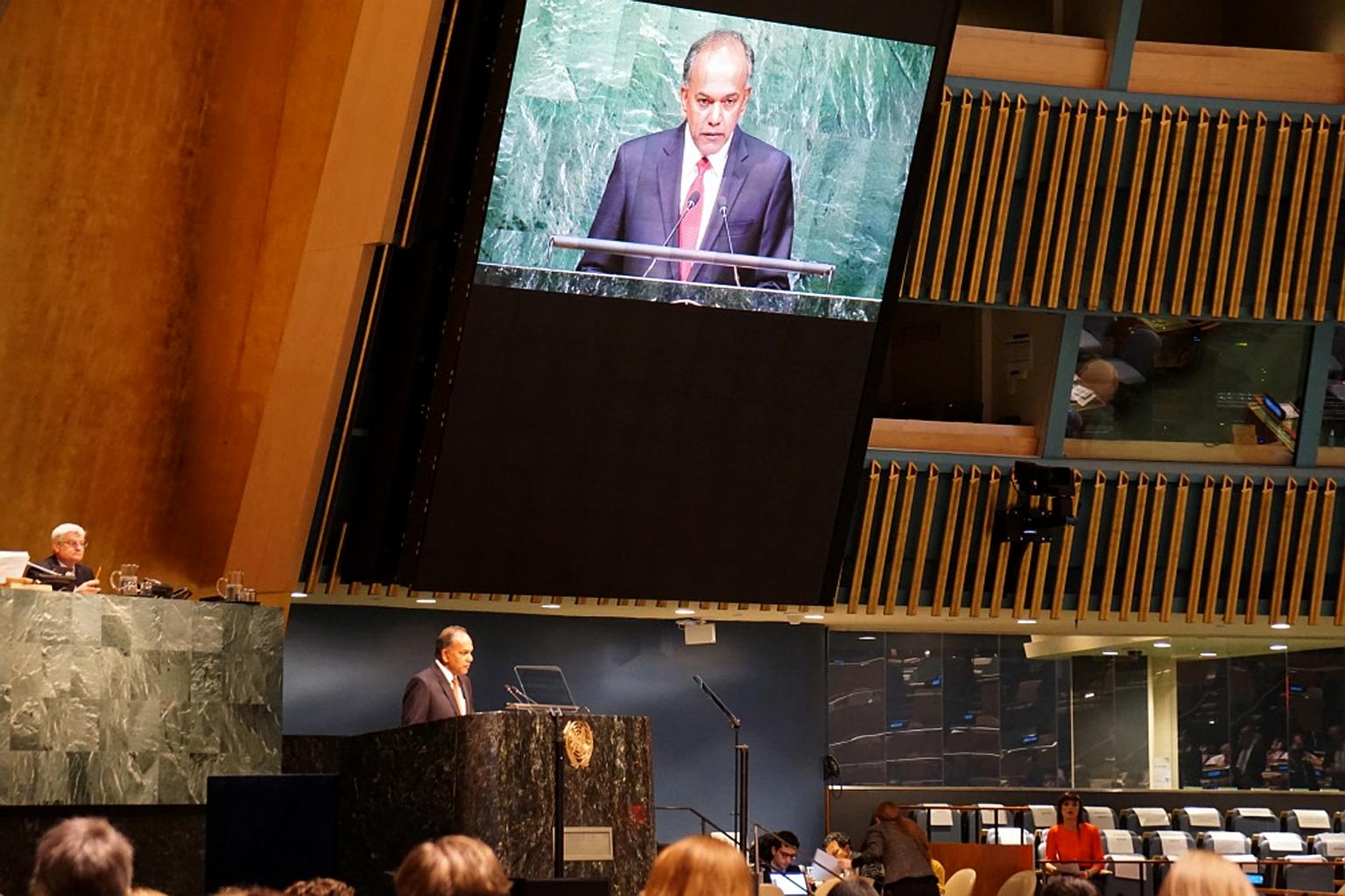 Mr Shanmugam speaking at the UN General Assembly in New York on Wednesday (April 20).