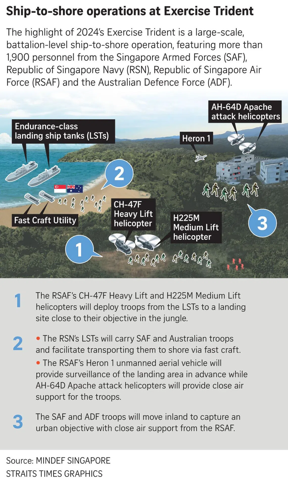 Senior Lieutenant-Colonel Enriquez Michael Zachary, the lead of the SAF contingent at the exercise, said that Exercise Trident was an opportunity for the SAF to train in an amphibious exercise at a scale, complexity and level of realism that was difficult to replicate in Singapore.