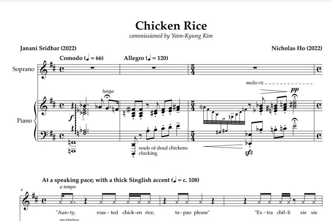 The score for Chicken Rice, composed by Dr Nicholas Ho with lyrics by Dr Janani Sridhar.