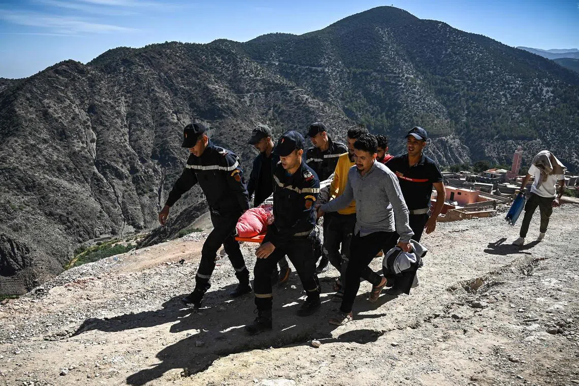 Civil defence responders evacuate an injured survivor in the village of Moulay Brahim in the High Atlas mountains of central Morocco on Sept 11.