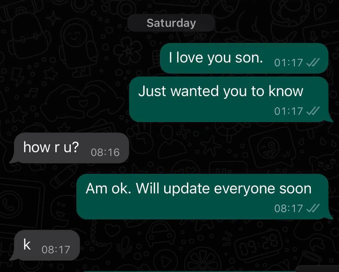 A screenshot of Mr Henson’s text message to his son on the night of Sept 8, expressing his love for him.