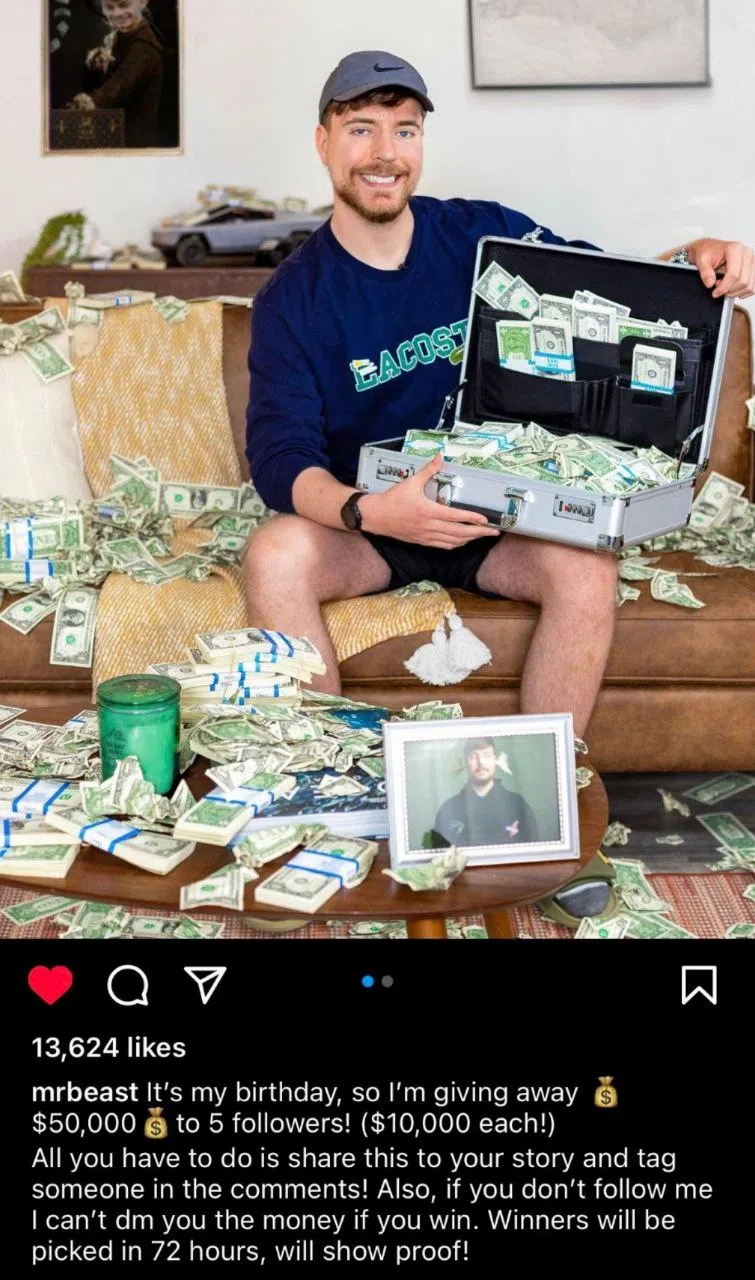 On Sunday, MrBeast posted a picture of himself with a briefcase full of cash on his Instagram page and announced his birthday giveaway.
