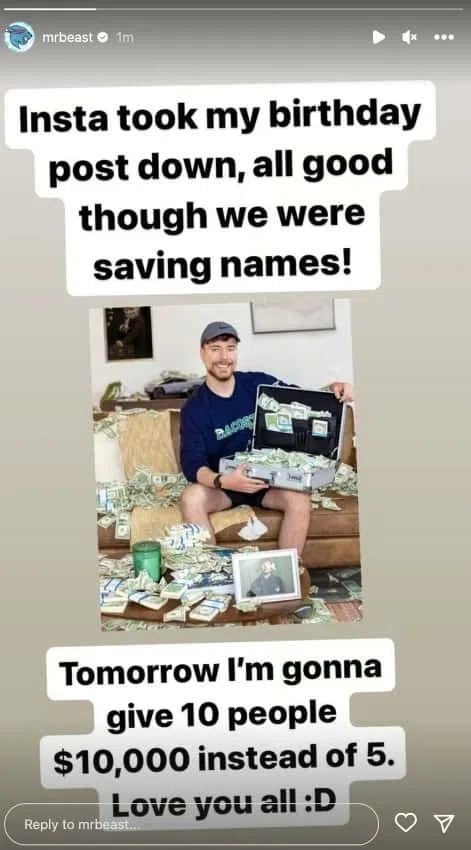 MrBeast then posted an Instagram Story assuring participants that his team had been “saving names” of the participants, and extended the giveaway to 10 winners, who will receive US$10,000 each.