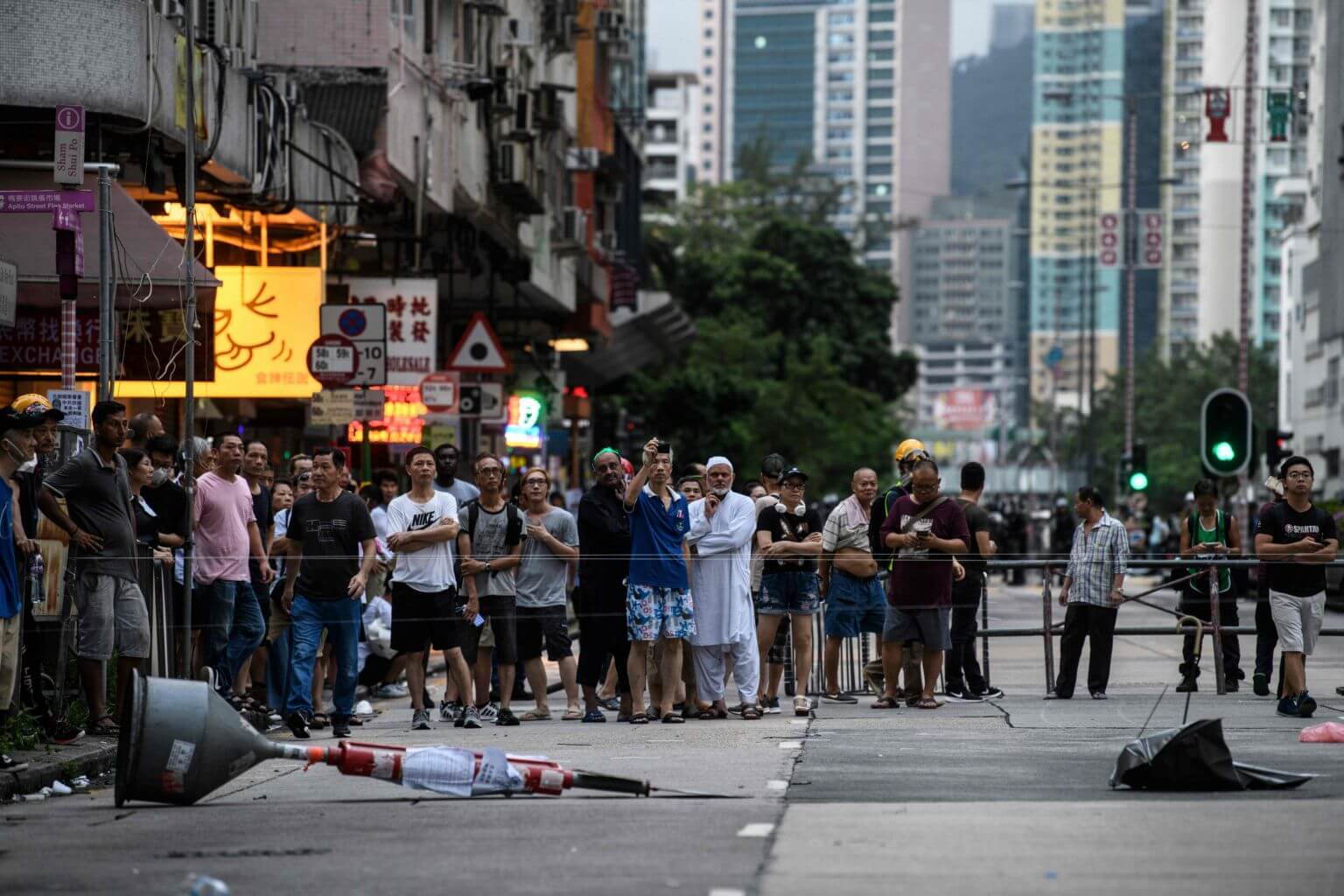Residents gather after tear gas was fired at protesters in Sham Shui Po in Hong Kong, on Aug 11, 2019.
