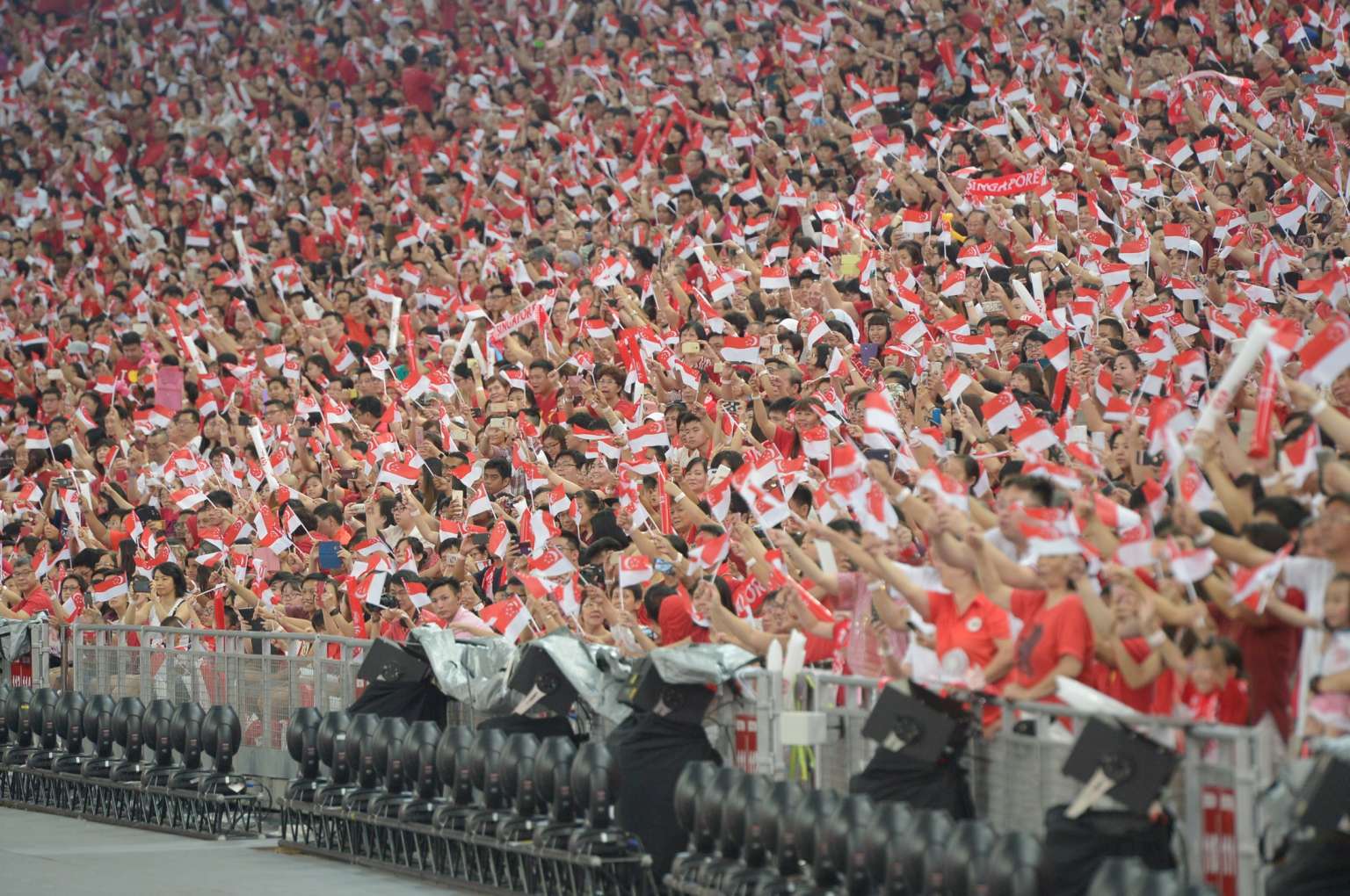 Singaporeans celebrating National Day Parade 2016 at National stadium.