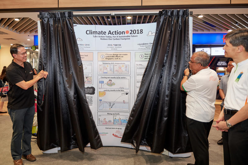 North West CDC Mayor Teo Ho Pin (left) and Environment and Water Resources Minister Masagos Zulkifli unveil new comic strips for the campaign, drawn by Straits Times artist Lee Chee Chew, as NEA Chief Executive Ronnie Tay (right) looks on.