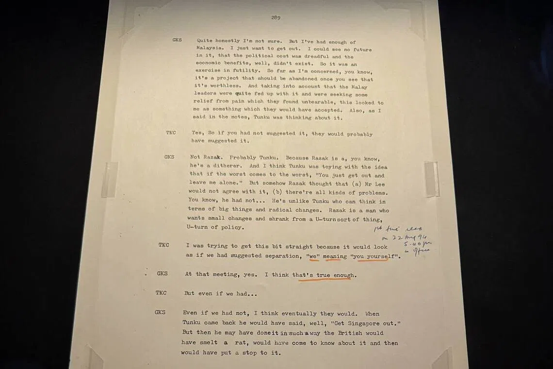 The transcript of Dr Goh Keng Swee’s oral history interview on July 17, 1982, with Mr Lee Kuan Yew’s handwritten notes on Aug 22, 1994, at the Albatross File exhibition at the National Library in Victoria Street.