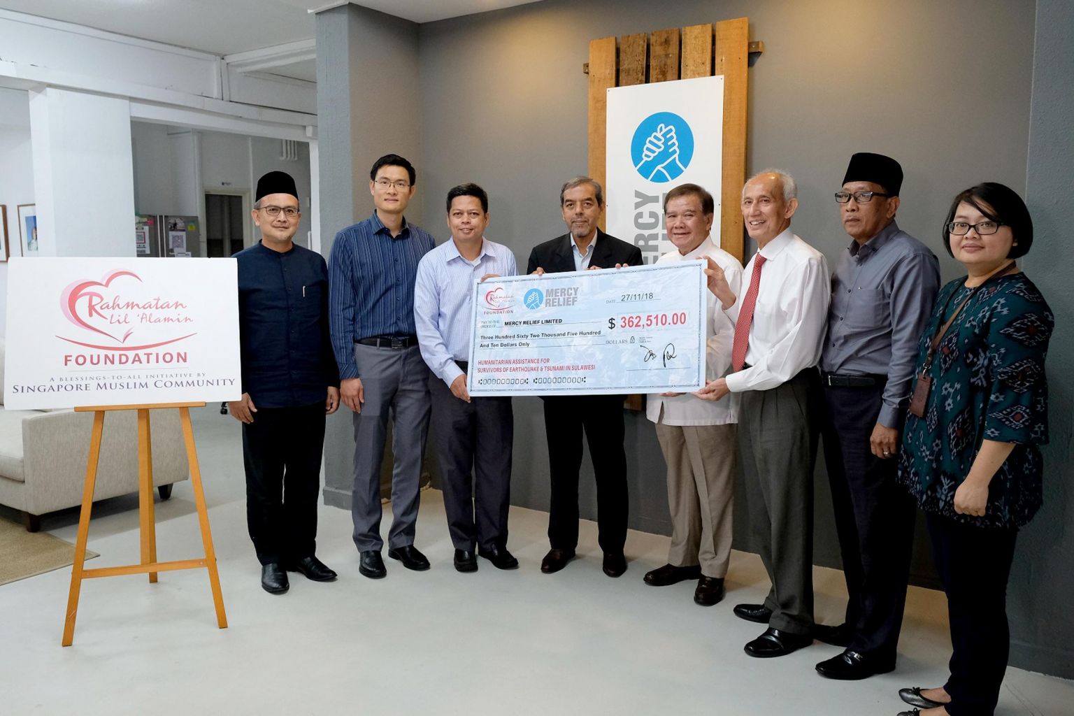 A cheque for $362,510 was presented on Tuesday (Nov 27) to independent disaster relief agency Mercy Relief Singapore, which plans to put the money towards recovery projects for survivors of the 7.4-magnitude quake and tsunami which left more than 1,200 people dead and 16,700 displaced.
