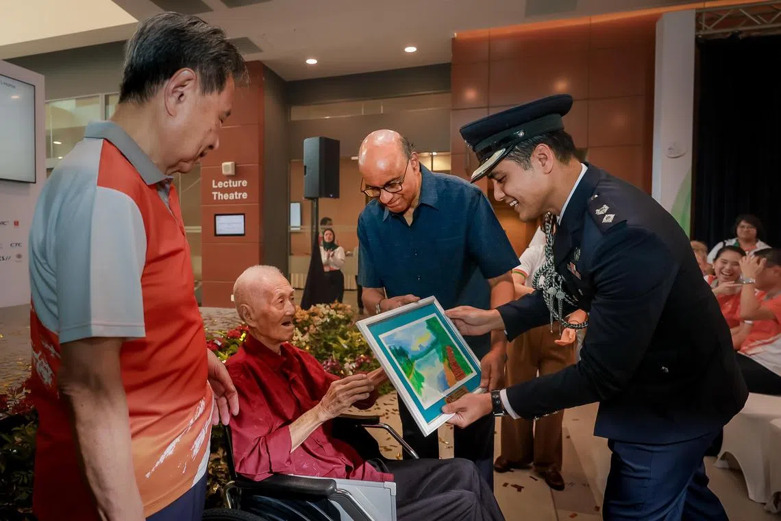 President Tharman Shanmugaratnam, with his aide, receiving a painting by beneficiary Thong Chew Lim, 97, a resident of St Joseph’s Home, as a token of appreciation, at the National Cancer Centre Singapore on Oct 5, 2024. With them is SingHealth chairman Cheng Wai Keung (left).