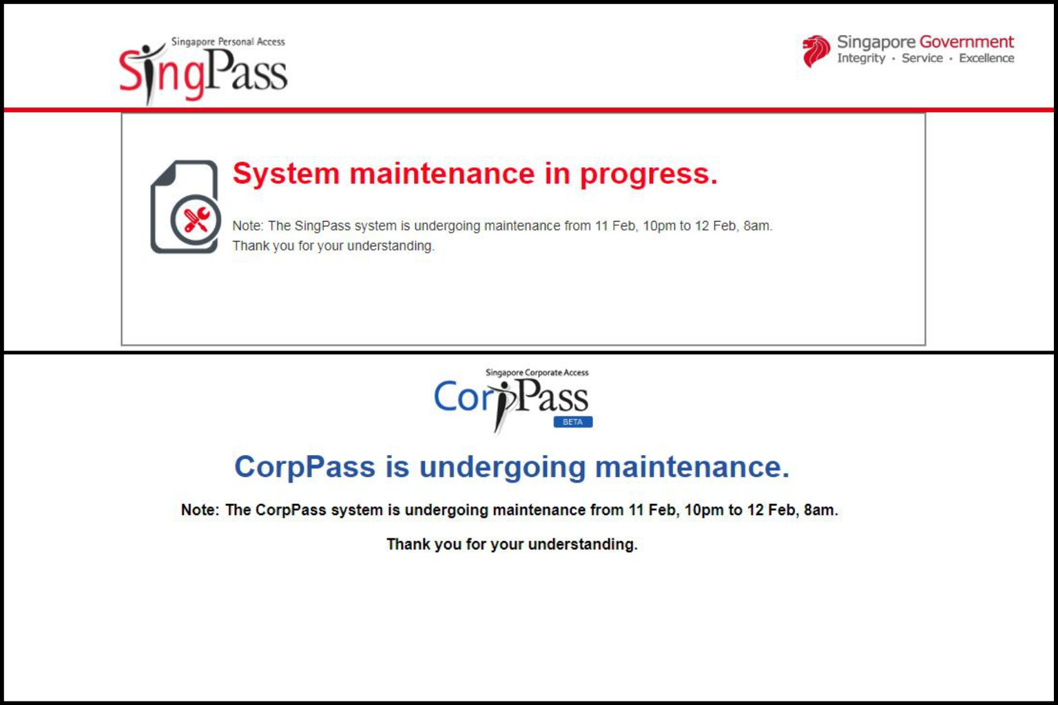 The SingPass and CorpPass systems are undergoing maintenance from 10pm on Feb 11, 2018 to 8am on Feb 12, and will be unavailable to users.