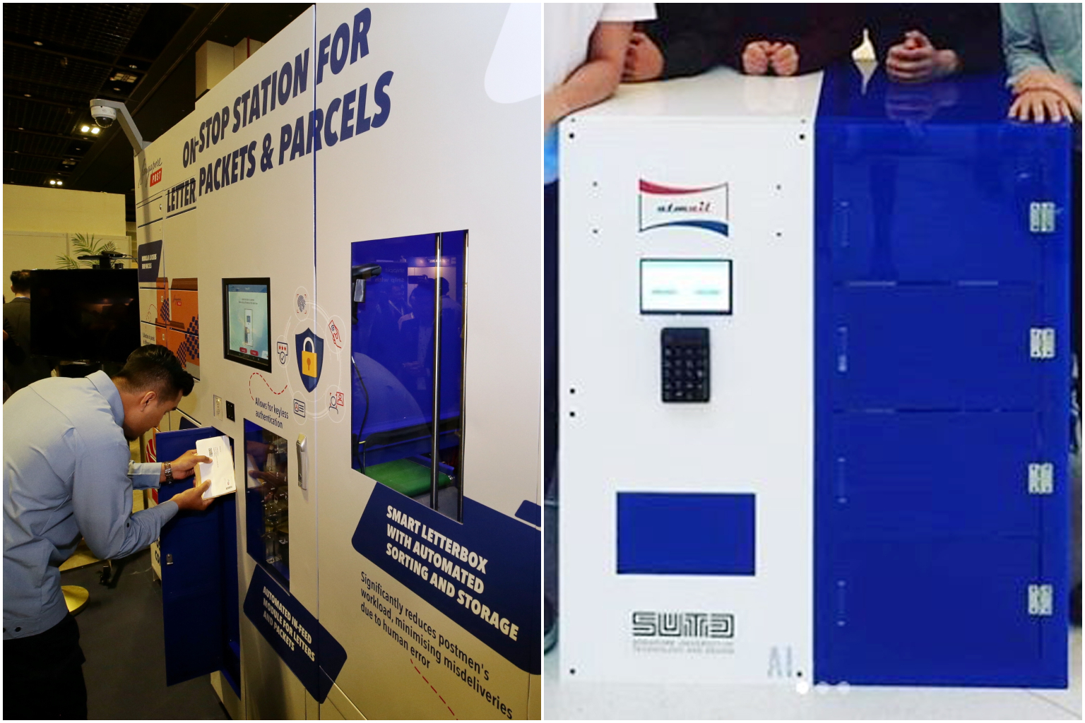 Left: SingPost's smart letterbox prototype. Right: A photo embedded in a public LinkedIn post by Singapore University of Technology and Design student Jerry Neo shows a machine described as an "auto mailbox".