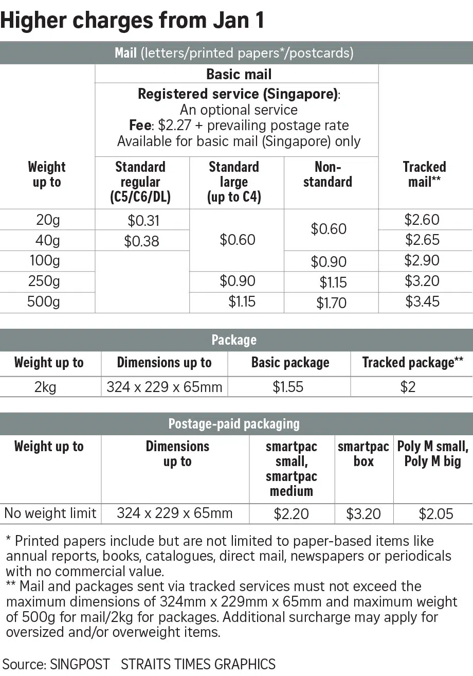 The Registered Service (Singapore) fee will also be increased, from $2.24 to $2.27 from 2023, and to $2.30 from 2024. This fee is payable on top of the applicable postage rates.