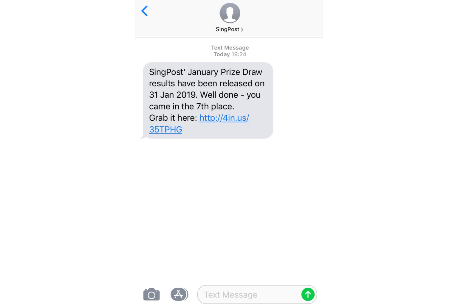 The postal service provider uploaded a photo of one such fake message on its Facebook page on Thursday (Feb 7). The message claims that recipients have won a prize in SingPost's "January Prize Draw", and tells users to click on a link to collect their prize.