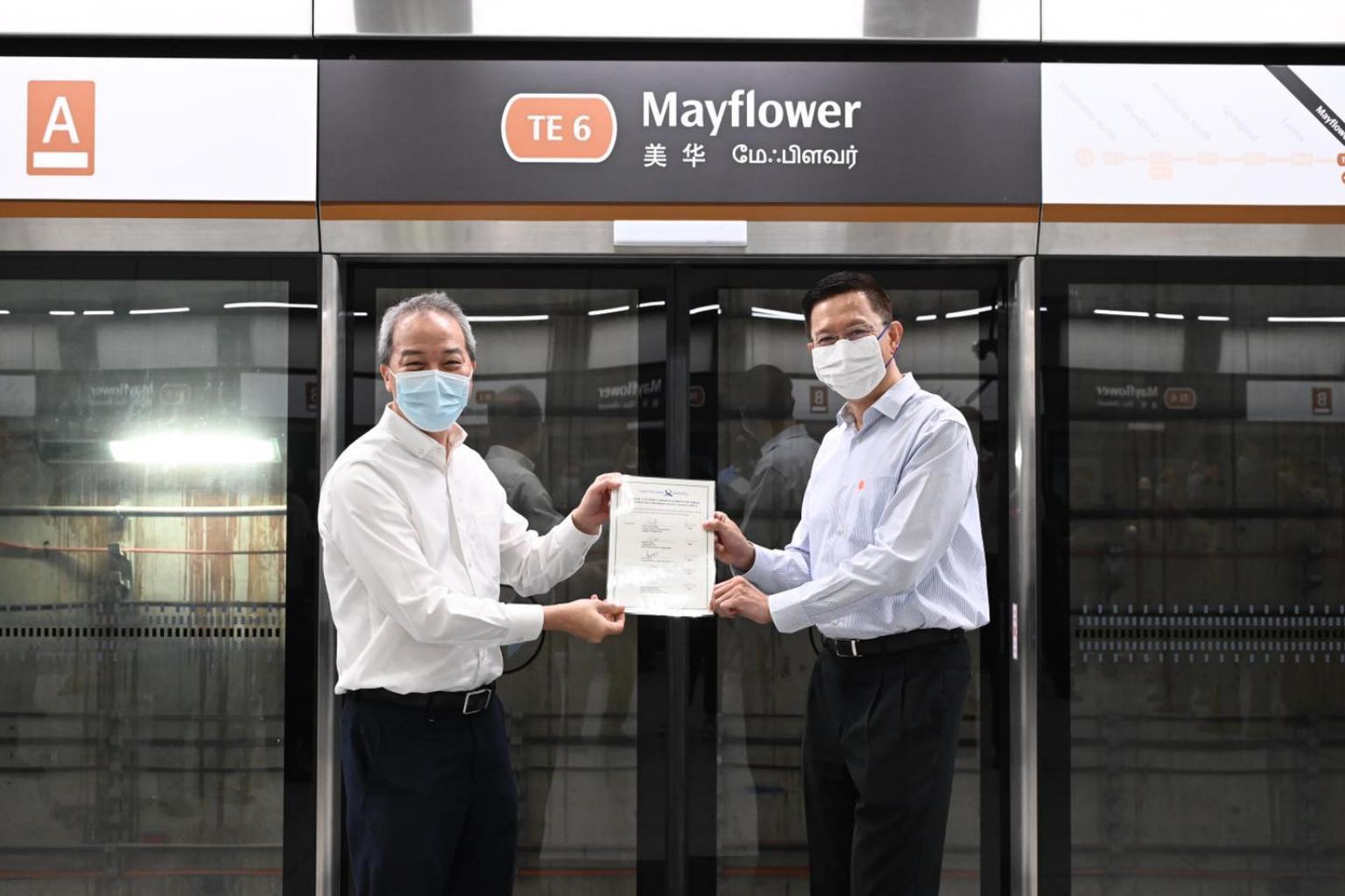 LTA CEO Ng Lang (left) presenting the handover certificate to SMRT Group CEO Neo Kian Hong at Mayflower station on April 30, 2021.