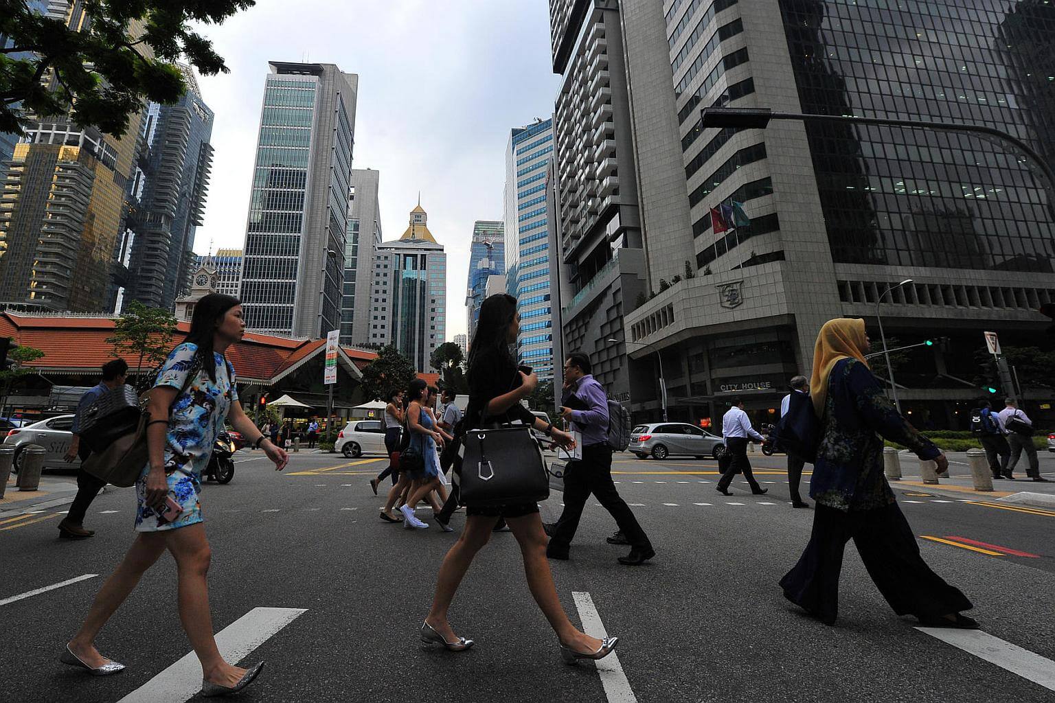 Office workers crossing the road at Robinson Road in the Central Business District after office hours on March 24, 2016.