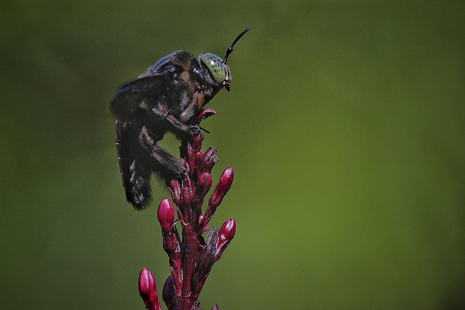 The male jet-black broad-handed carpenter bee is territorial, and the one seen here is perching on a tall flower to guard its area. It also swoops down to fight enemies such as butterflies that enter its territory. This species of bee is the largest in Peninsular Malaysia.