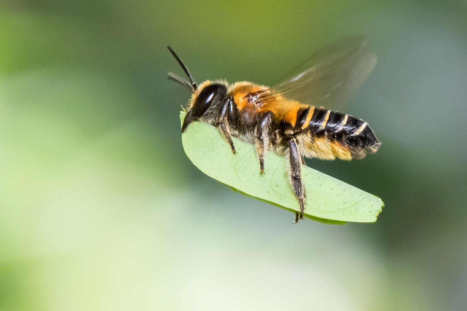 Body: 1.2cm; head and thorax are covered with fiery orange-red hair. This locally widespread bee is found in rooftop gardens, beaches and mangroves. It is partial to the pollen from legumes and the daisy-like aster flower. It has been found living in man-made bee hotels furnished with tiny pieces of leaves that it cuts and carries home.