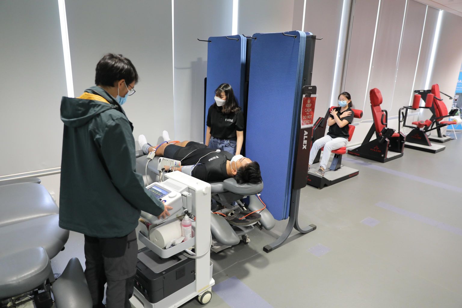 Republic Polytechnic students and a staff member (left) carrying out a non-invasive vascular risk assessment in the new Health Promotion Innovation Laboratory.