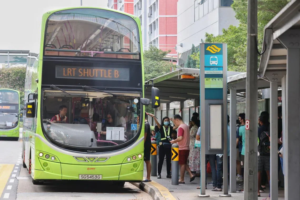Commuters queueing for a free shuttle bus service, which plies the Bukit Panjang LRT Service B route, at Choa Chu Kang station on Oct 1, 2023.