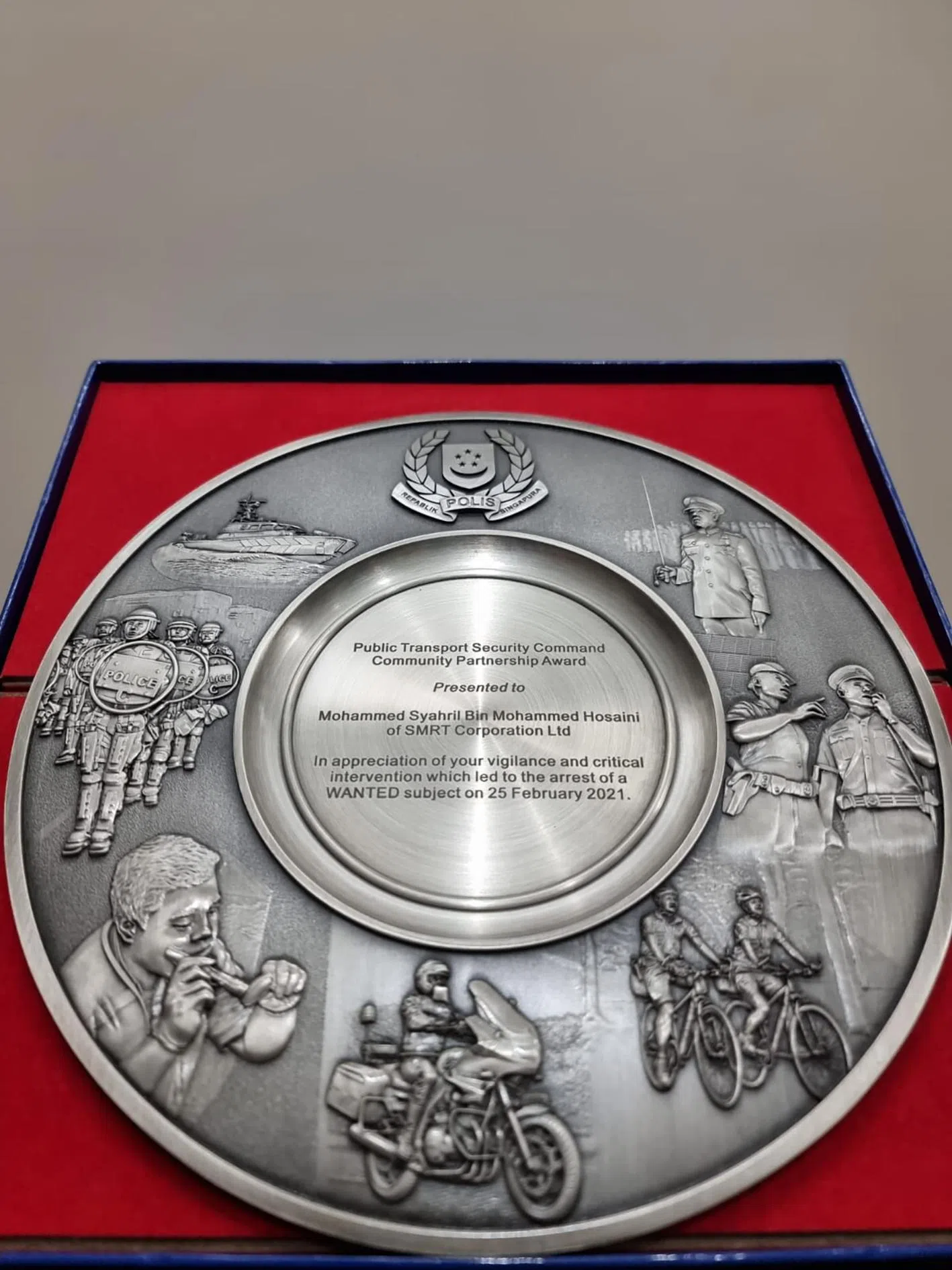 SMRT staff member Mr Syahril Hosaini received an award from the police for helping officers in their efforts to apprehend a suspect in 2021.