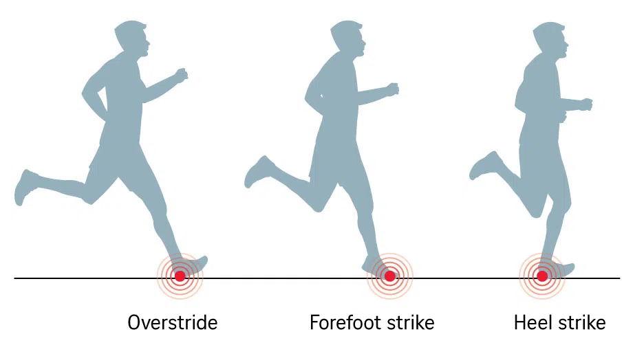 • Heel strike refers to the runner landing with the heel. It is more energy-efficient at slow to medium speeds. However, it also exerts additional strain on the knees, leading to knee and hip pain.