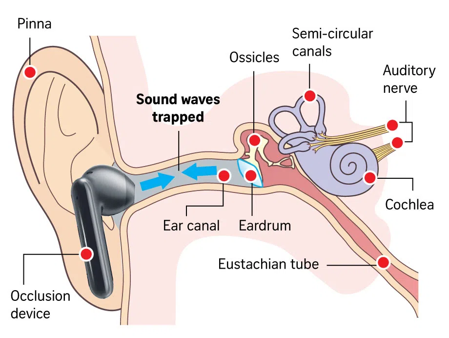 • An occlusion effect happens when an object fills the outer portion of a person’s ear canal, causing that person to perceive echo-like hollow or booming sounds generated from his own voice.