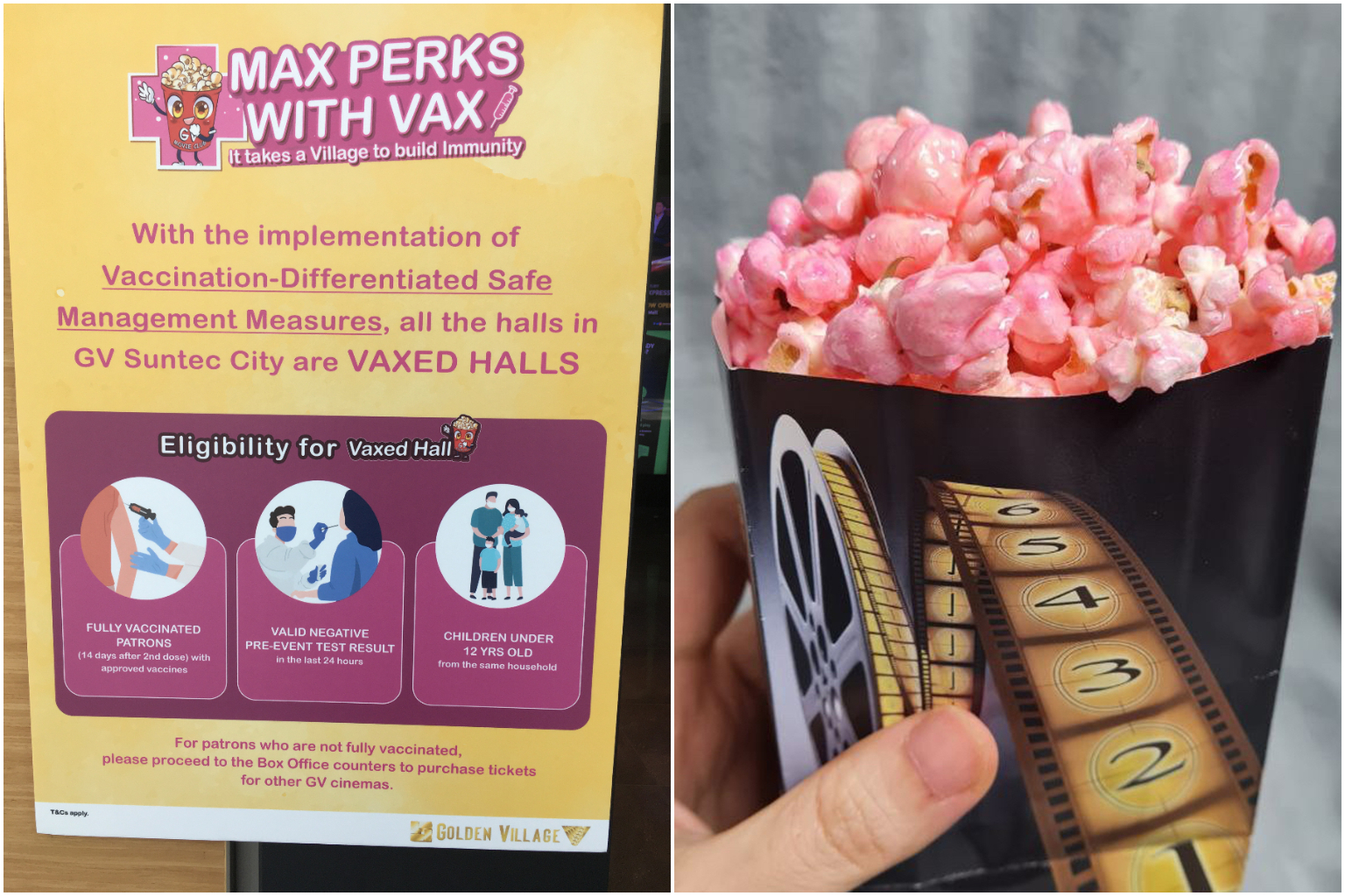Golden Village has opened "Vaxed Halls" at four locations, while Cathay is offering vaccinated patrons free mini strawberry-glazed popcorn.