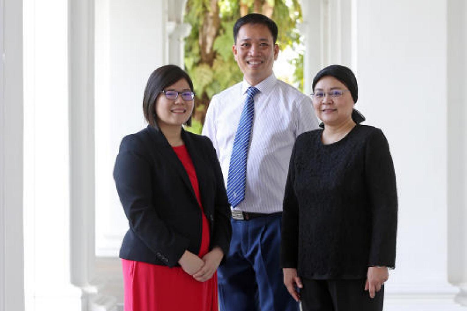 (From left) Promising Social Worker Award (PSWA) recipient (left) Ms Kristine Lam, Outstanding Social Worker Award (OSWA) recipients Dr Vincent Ng, and Ms Zahara Mahmood receive their award from President Halimah Yacob at Istana on Dec 1, 2017.