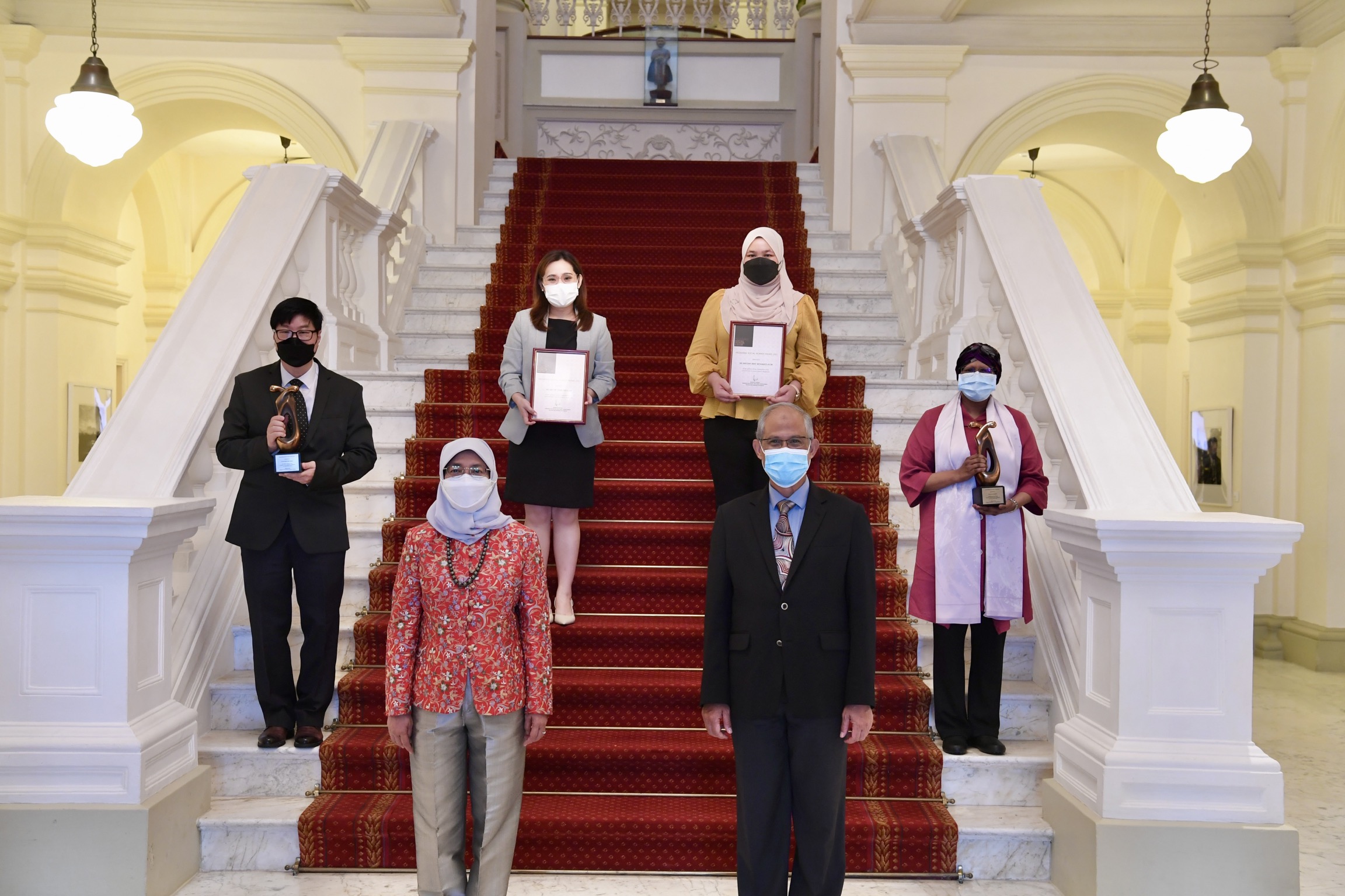 President Halimah Yacob and Minister Masagos Zulkifli with the award winners at the Istana on Nov 23, 2021.