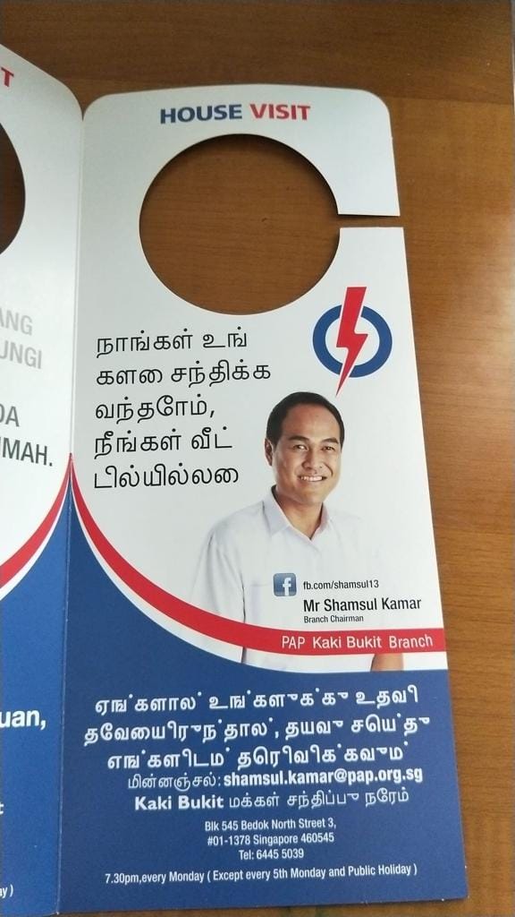SINGAPORE - PAP's Kaki Bukit branch chairman Shamsul Kamar apologised on Facebook on Sunday (Jan 13) after door hanger brochures containing translation errors in Tamil were distributed to residents.