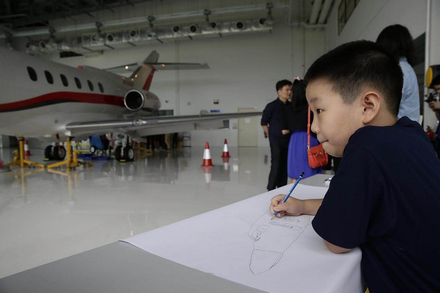 Nine-year-old Huo Xi Cheng, who has Acute Myeloid Leukemia, sketches a picture of the Hawker Siddeley 700A private jet at Temasek Aviation Academy on Nov 25, 2016.