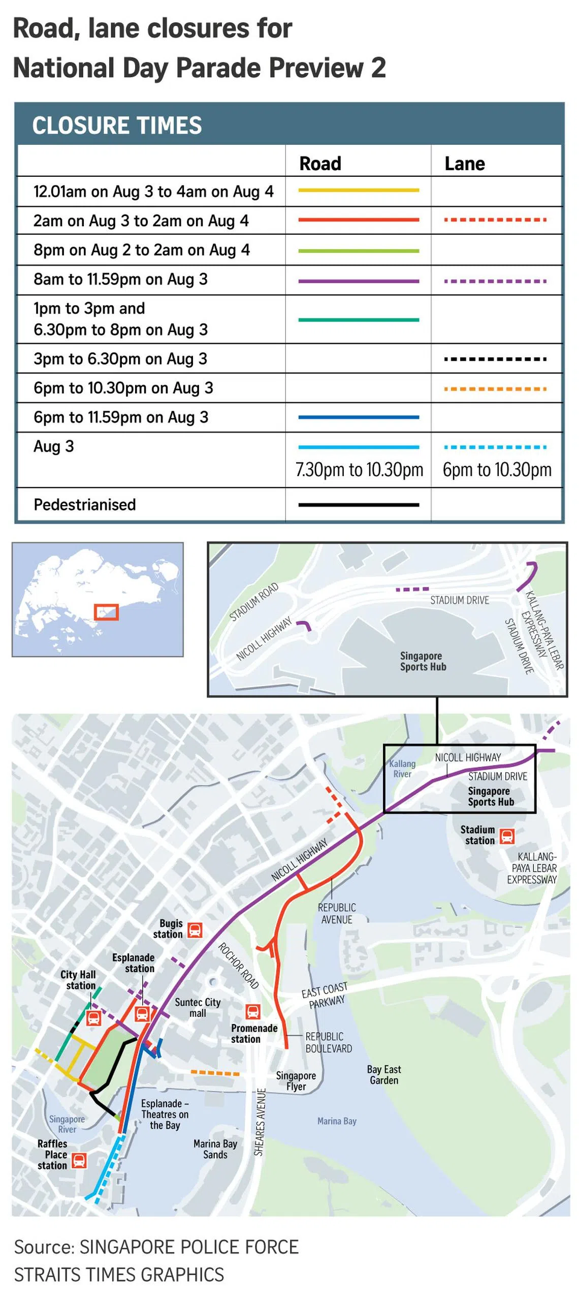 SINGAPORE – Some exits of MRT stations around Marina Bay will be closed on Aug 3 for crowd control, in view of the National Day Parade (NDP) Preview 2 at the Padang.