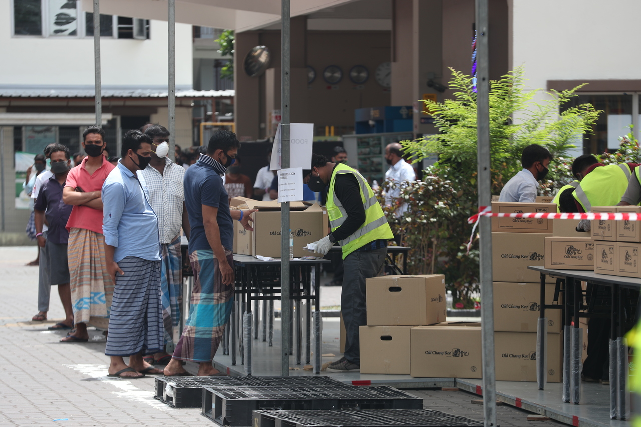Migrant workers queue to collect food on April 18, 2020. They are residents of Jurong Penjuru Dormitory 1.