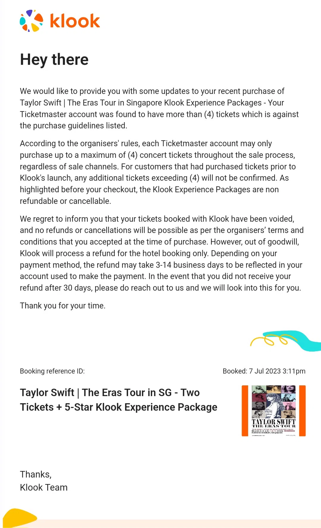 One concertgoer was informed via e-mail that her package was voided, and she would only receive a partial refund out of goodwill. However, she was later informed by Klook that she would receive a full refund.