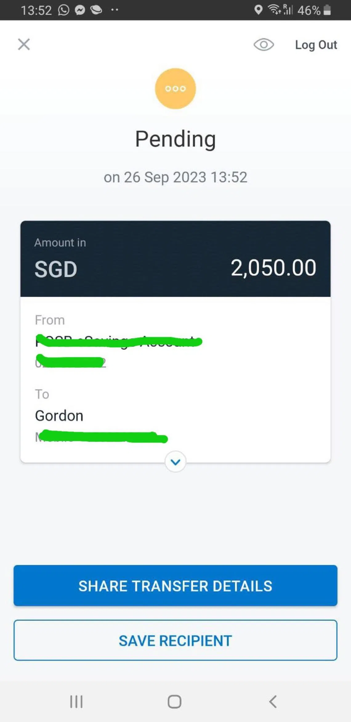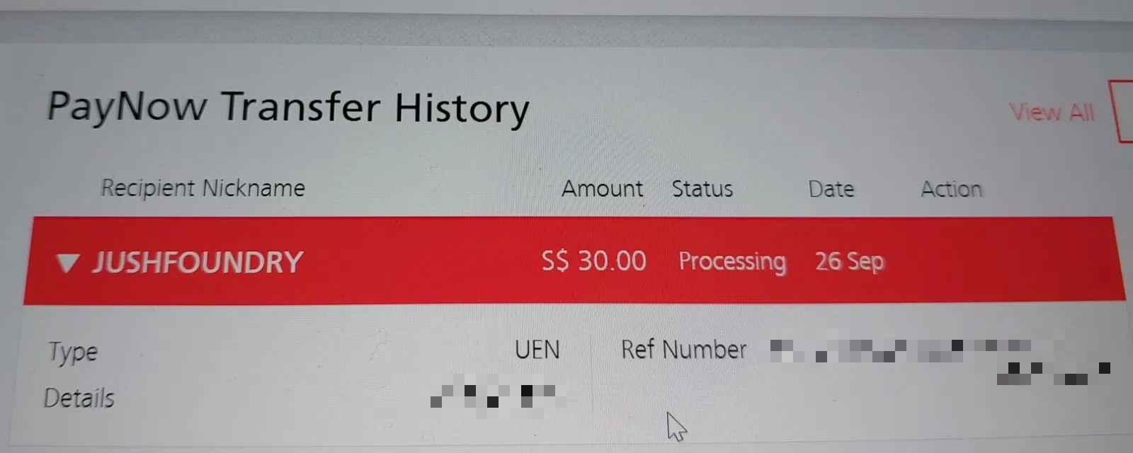 “He (the recipient) kept telling me that he had not received the money. I’ve seen the amount deducted from my bank account but it still states ‘Pending’ on my PayNow transaction history,” said Mr Laird, who is in his late 60s and works in the marine industry.