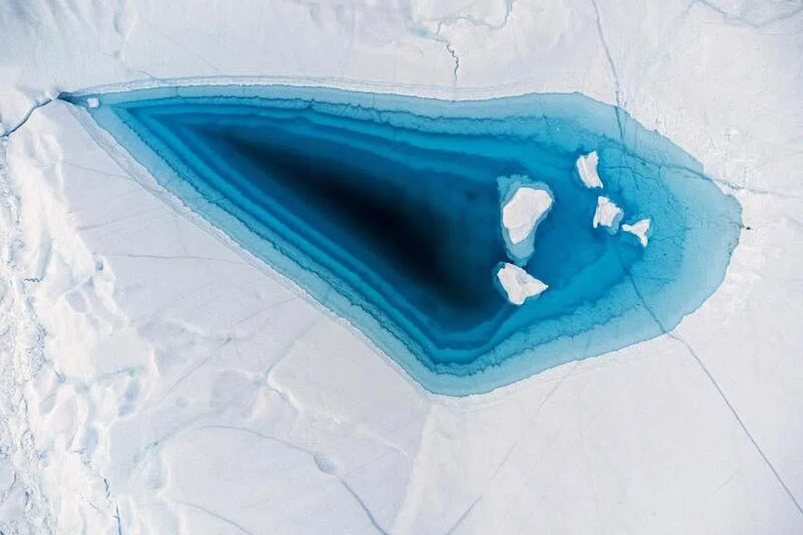 Turquoise water is seen in a large melt hole on top of an iceberg in Disko bay, Ilulissat, western Greenland, on June 29, 2022. Researchers use underwater microphones to listen to glaciers melting.