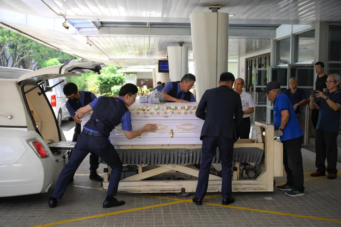Ms Audrey Fang’s casket arriving at Mandai Crematorium on April 29.