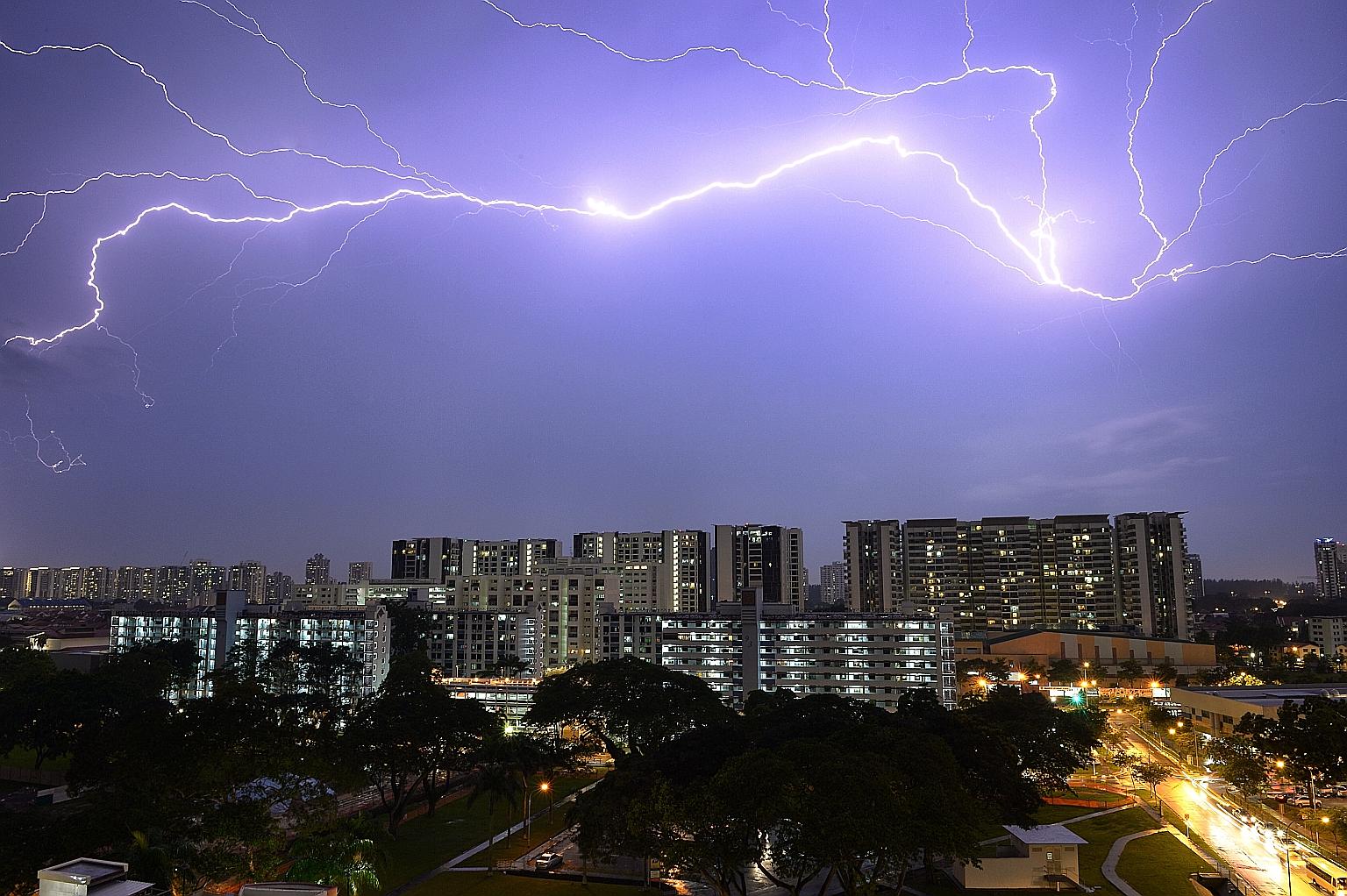 Lightning flashing across the night sky in November 2013, during a thunderstorm at the junction of Chai Chee Road and New Upper Changi Road. The heavy rain left Singapore with flash floods.