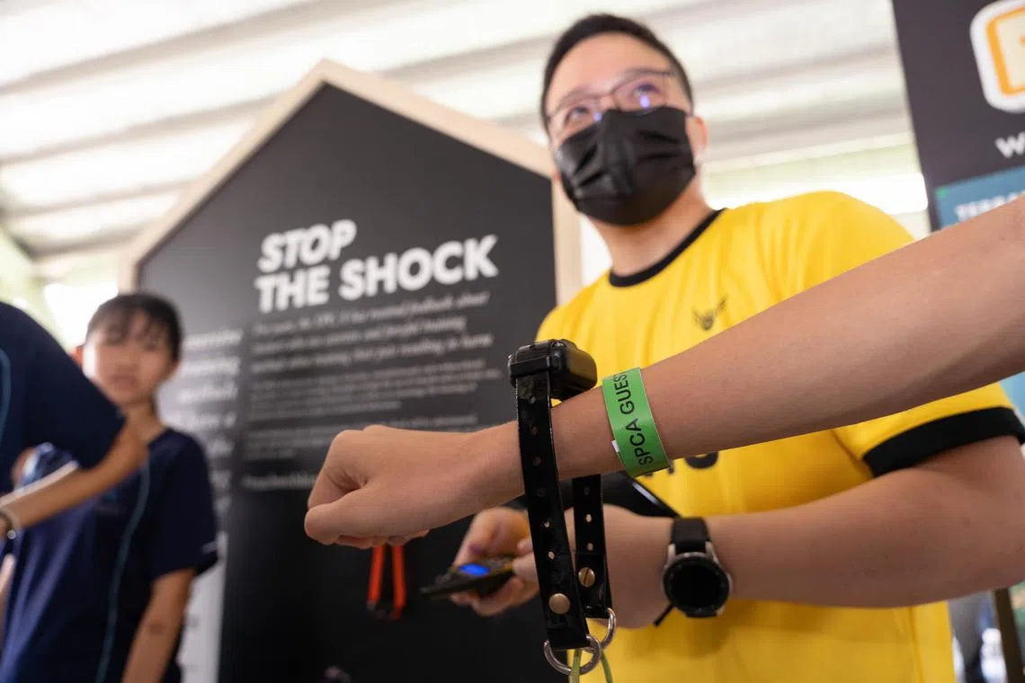 SPCA volunteer Leong Jun Yi letting students from Bowen Secondary School experience the shock collar at the Pawsome Pawty event.