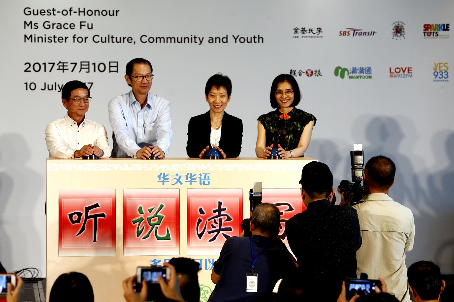 (From left) Mr Roland Ng, Mr Seow Choke Meng, Chairman, Minister Grace Fu and Ms Chang Hwee Nee, at the launch of the Speak Mandarin Campaign on July 10, 2017.